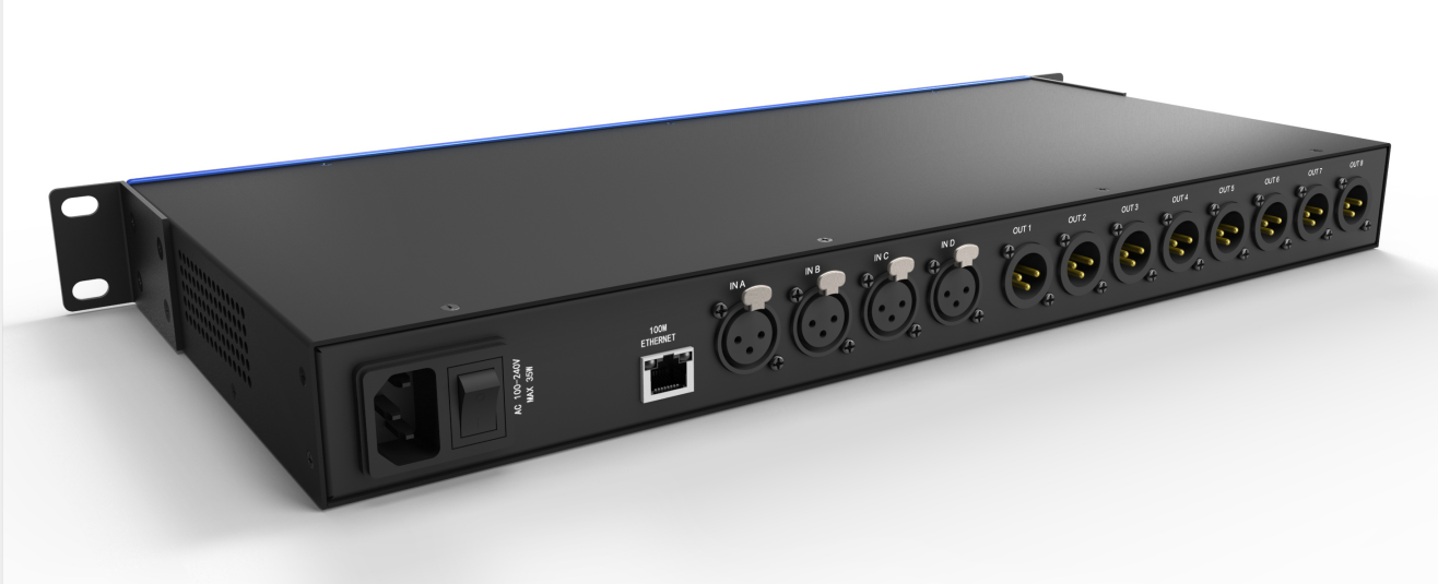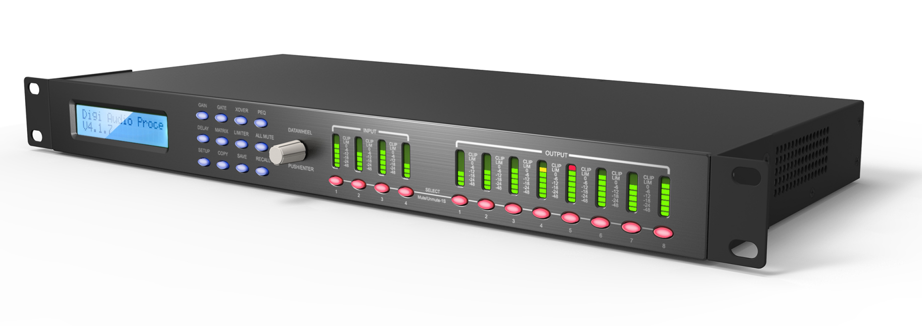 本4進8出的音箱處理器,使用最新的第四代SHARC ADSP-2148X 400Mhz浮點DSP,具有強大的DSP處理能力。每個輸入、輸出有16段參數(shù)濾波器,增益控制、噪聲門功能、RMS壓限、內(nèi)置的粉紅/白噪聲發(fā)生器,以及可調(diào)的延時。分頻器的斜率從6dB/Oct到48dB/Oct范圍內(nèi)可選。延時步進精度0.02ms,電平增益精度0.1dBu,滿足現(xiàn)場精細調(diào)節(jié)。