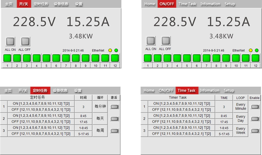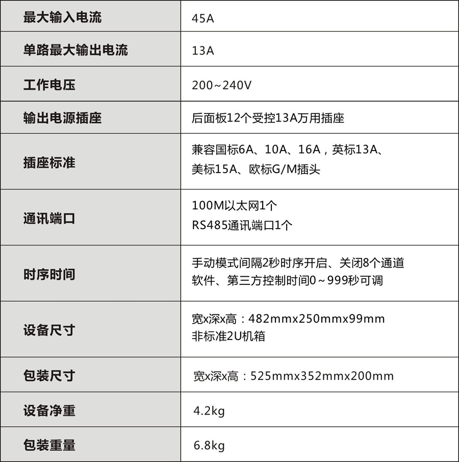每臺(tái)設(shè)備具有獨(dú)立的IP地址、設(shè)備位置標(biāo)簽、軟件可以監(jiān)控到所有設(shè)備狀態(tài).具有開(kāi)放的通信協(xié)議,允許工程用戶集成到任何控制系統(tǒng)、軟件中,實(shí)現(xiàn)您想要的控制功能。每臺(tái)設(shè)備具有獨(dú)立的IP地址、設(shè)備位置標(biāo)簽、軟件可以監(jiān)控到所有設(shè)備狀態(tài),可獨(dú)立控制每個(gè)通道,每個(gè)設(shè)備可以設(shè)置日程計(jì)劃任務(wù),根據(jù)計(jì)劃任務(wù)自動(dòng)運(yùn)行,除了集成了先進(jìn)的控制功能外,根據(jù)現(xiàn)今工程需求進(jìn)行功能改良,后面板采用12個(gè)13A萬(wàn)能插座,能兼容各種標(biāo)準(zhǔn)電源接口。